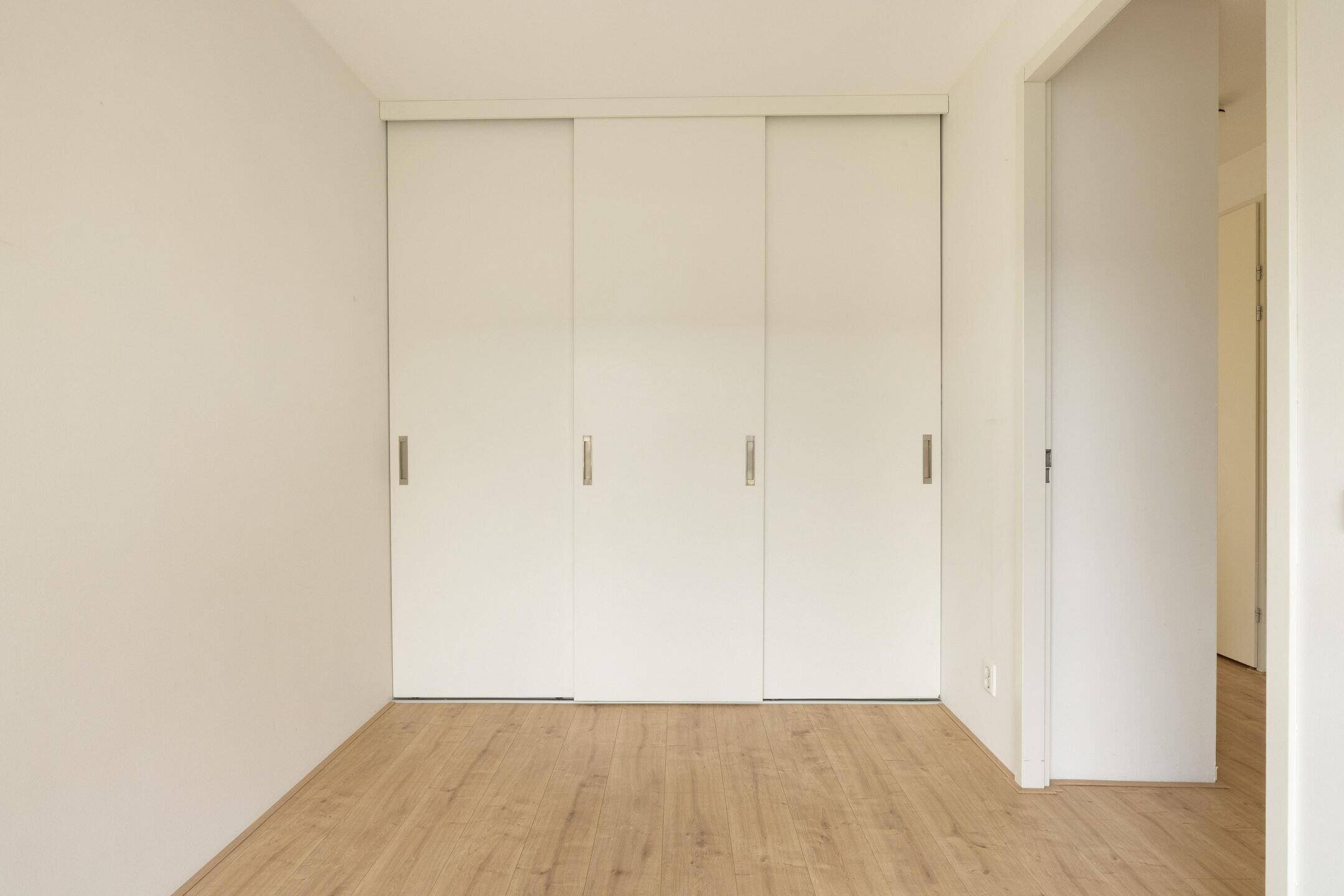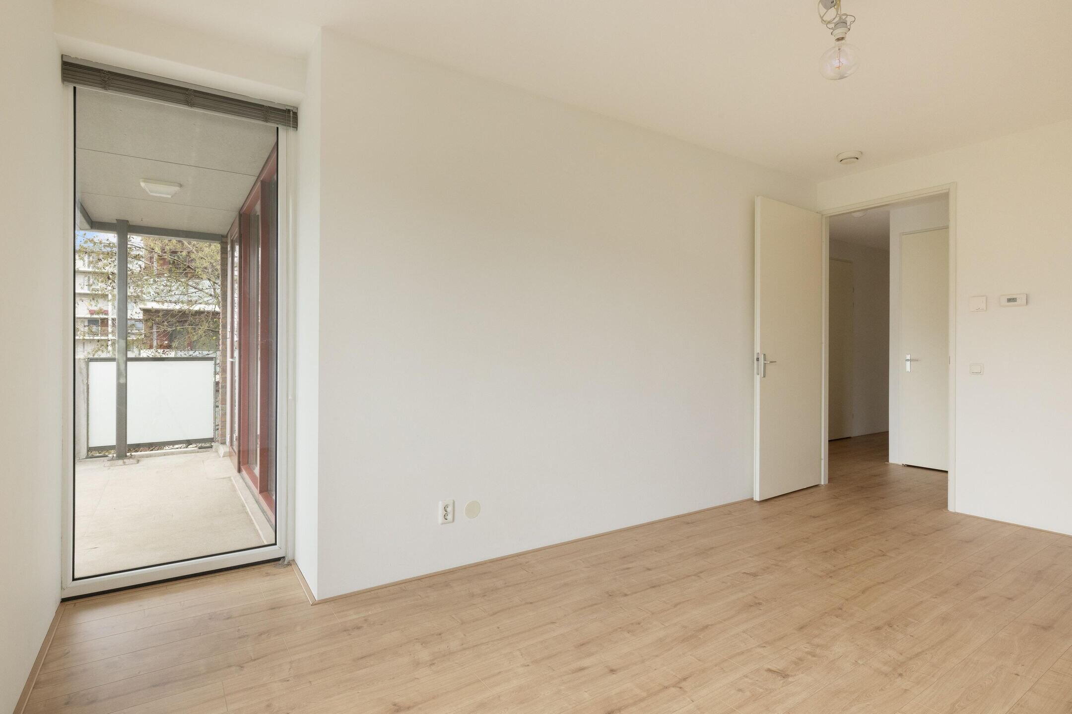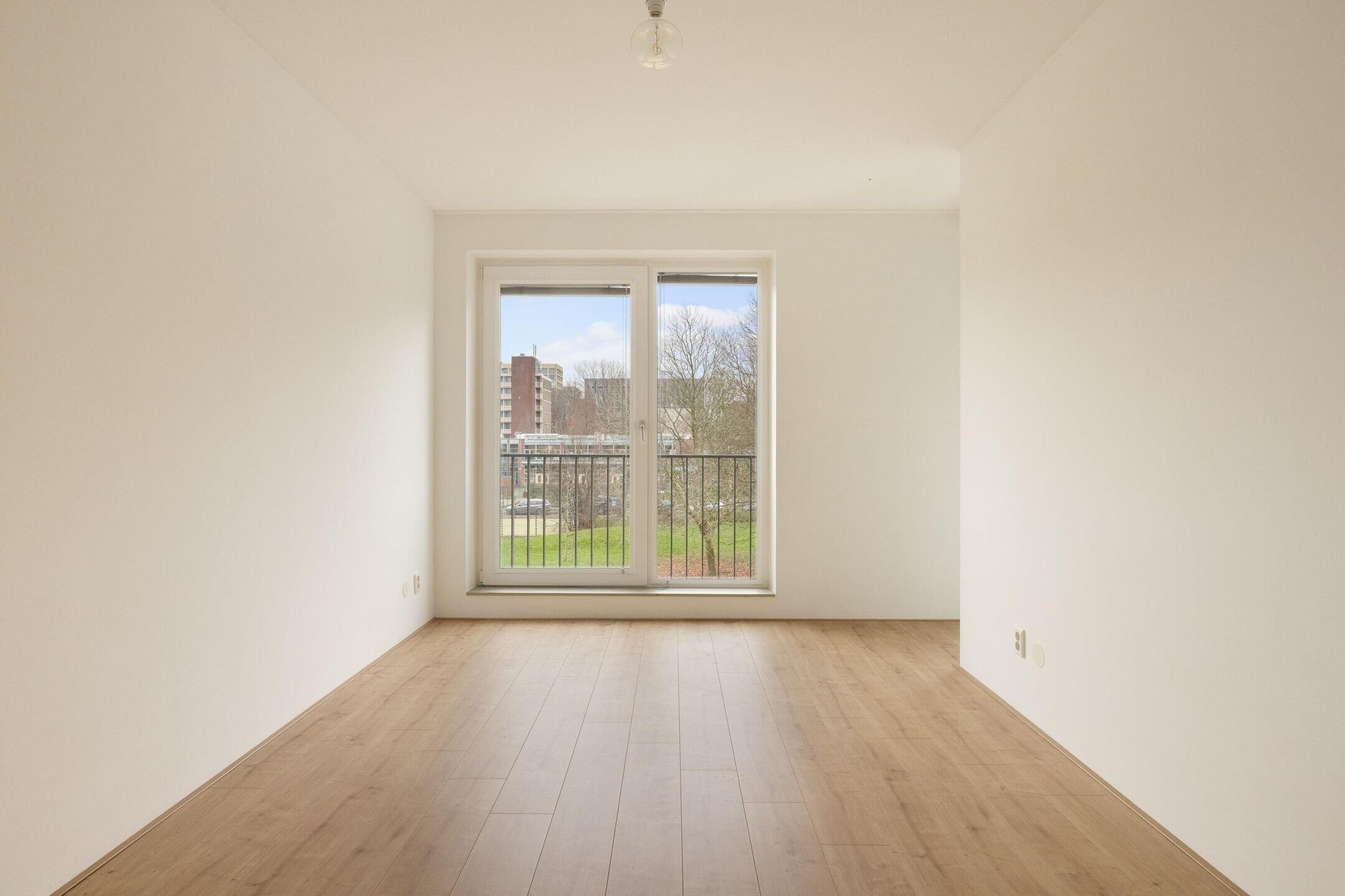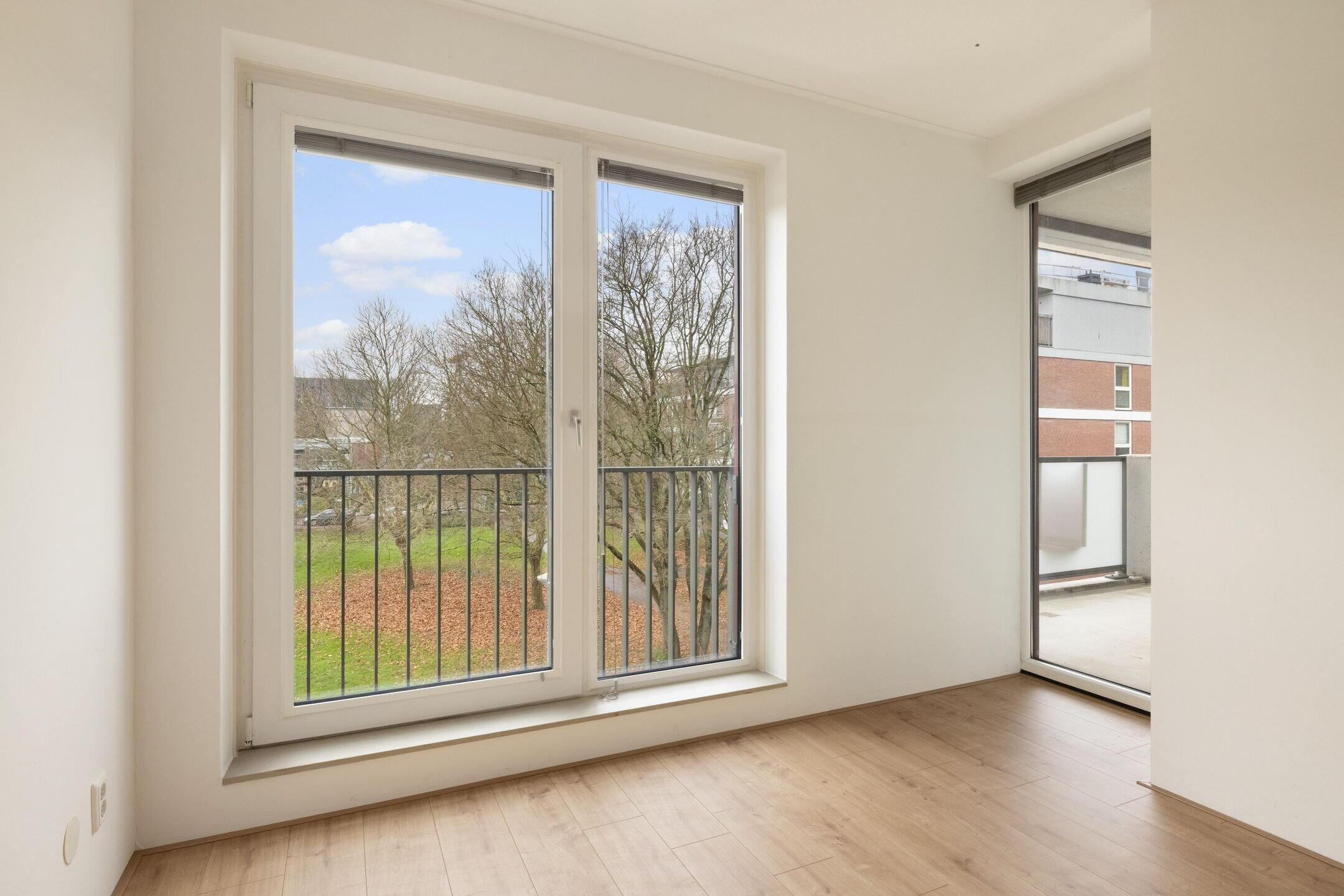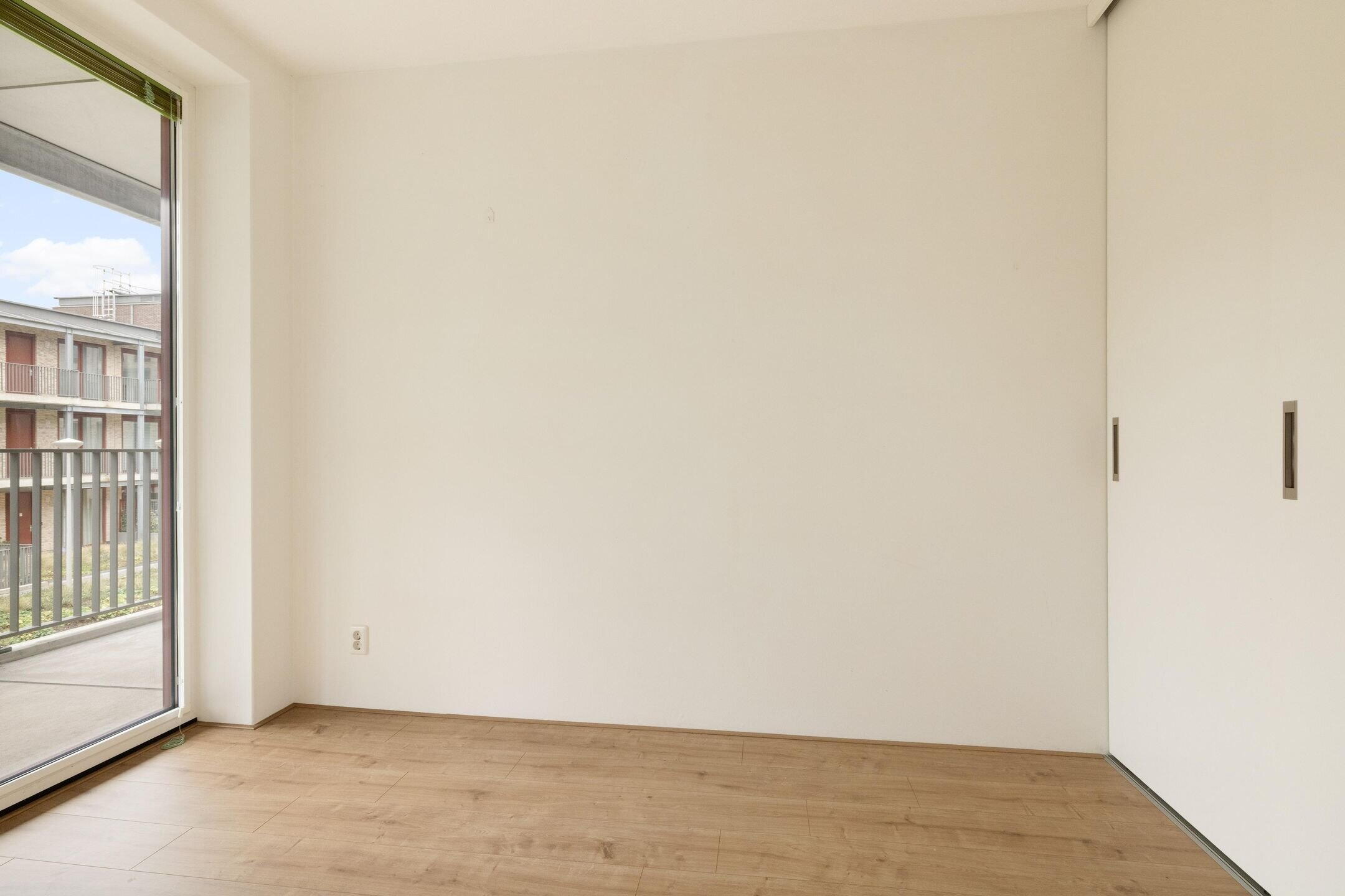 De tweede slaapkamer bevindt zich aan de voorzijde van het appartement. Deze kamer is voorzien van ingebouwde kasten en twee ramen tot aan de vloer met uitzicht op de gemeenschappelijke tuin. Ideaal als logeerkamer, kinderkamer of thuiskantoor.